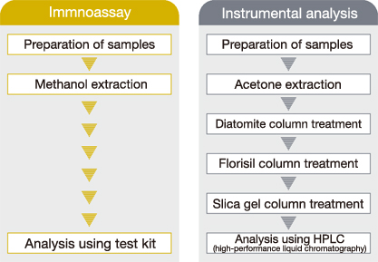 While instrumental analysis offers high accuracy, it requires complicated and time-consuming pretreatment techniques, and sophisticated instrument operation as well as large quantities of acetone, hexane or acetic ether as organic solvents. The simpler pretreatment required for kit saves significant time. Additionally, only a small quantity of methanol is required as an extraction solvent for analyzing azoxystrobin.
