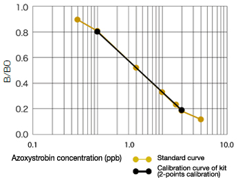 Azoxystrobin is one of strobilurin fungicides synthesized from materials derived from basidiomycetes. It is used for multiple farm products as pesticide because of its strong fungicidal activity to a variety of fungi. This kit allows an easy, rapid (within 2 hours), sensitive, quantitative, multi-sample analysis of azoxystrobin that remains in farm products or in the environment. This kit is best applied for inspection at delivery time/prior to processing or primary screening in production sites.