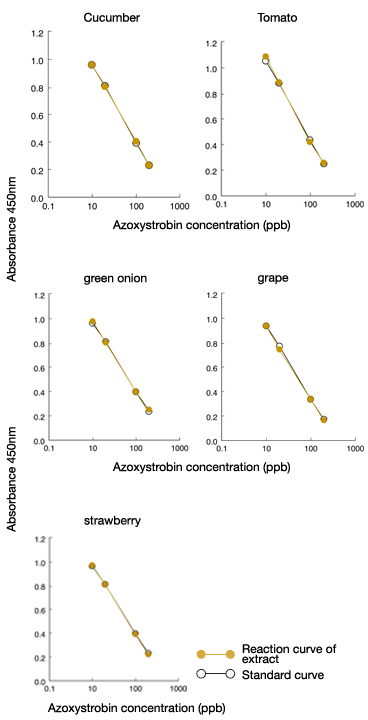 The figures show the comparison between standard curves with 10% methanol and reaction curves drawn with methanol extract of azoxystrobin-added farm products (diluted to 10% methanol equivalent). The overlapping curves; demonstrate the suitability of this kit for analyzing trace azoxystrobin without any interference from the original produce.