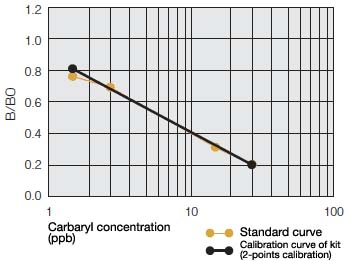 Carbaryl is a carbamate insecticide. It is used for multiple farm products because of its long-lasting effect. This kit allows an easy, rapid (within 2 hours), sensitive, quantitative, multi-sample analysis of carbaryl that remains in farm products. This kit is best applied for inspection at delivery time/prior to processing or primary screening in production sites.