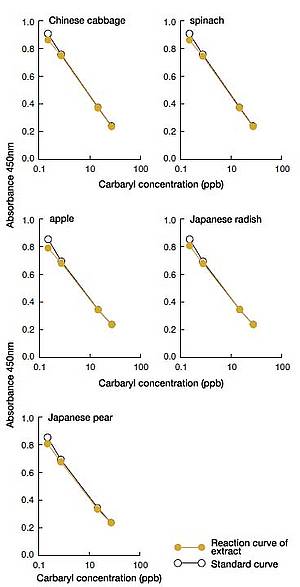 The figures show the comparison between standard curves with 10% methanol and reaction curves drawn with methanol extract of carbaryl –added farm products (diluted to 10% methanol equivalent). The overlapping curves; demonstrate the suitability of this kit for analyzing trace carbaryl without any interference from the original produce.
