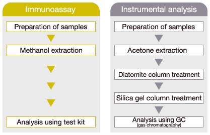 While instrumental analysis offers high accuracy, it requires complicated and time-consuming pretreatment techniques,and sophisticated instrument operation as well as large quantities of hexane or diethyl ether as organic solvents. The simpler pretreatment required for kit saves significant time. Additionally, only a small quantity of methanol is required as an extraction solvent for analyzing chlorfenapyr.