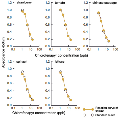 The figures show the comparison between standard curves with 10% methanol and reaction curves drawn with methanol extract of chlorofenapyr-added farm products (diluted to 10% methanol equivalent). The overlapping curves; demonstrate the suitability of this kit for analyzing trace chlorofenapyr without any interference from the original produce.