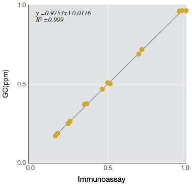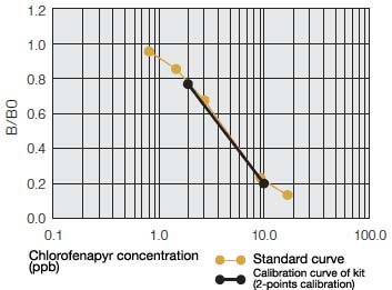 Chlorfenapyr is an insecticide and is used for multiple farm products because of its wide insecticidal activity range. This kit allows an easy, rapid (within 2 hours), sensitive, quantitative, multi-sample analysis of chlorfenapyr that remains in farm products. This kit is best applied for inspection at delivery time/prior to processing or primary screening in production sites.