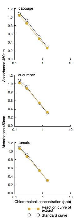 The figures show the comparison between standard curves with 10% methanol and reaction curves drawn with methanol extract of chlorothalonil-added farm products (diluted to 10% methanol equivalent). The overlapping curves; demonstrate the suitability of this kit for analyzing trace chlorothalonil without any interference from the original produce.