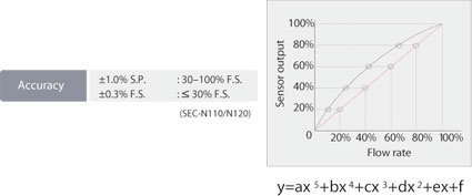 MFC’ s linearity is compensated by polynomial approximated curve. This achieves high accuracy for a l l flow control ranges. For the purpose of advancement of actual gas accuracy, the calibration date of various process gases are measured by HORIBA STEC standard gas measurements system.