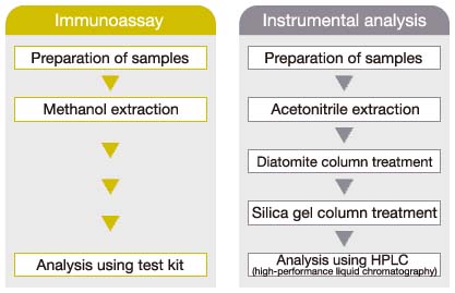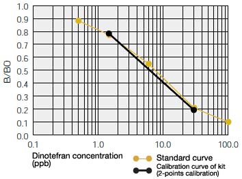 Dinotefuran is one of neonicotinoid insecticides. It is used for multiple farm products because of its wide insecticidal activity range. This kit allows an easy, rapid (within 2 hours), sensitive, quantitative, multi-sample analysis of dinotefuran that remains in farm products or in the environment. This kit is best applied for inspection at delivery time/prior to processing or primary screening in production sites.