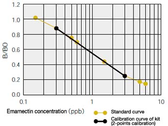 Emamectin is one of macrolide insecticides. It is used for multiple farm products because of its wide insecticidal activity range. This kit allows an easy, rapid (within 2 hours), sensitive, quantitative, multiple sample analysis of emamectin that remains in farm products or in the environment. This kit is best applied for inspedtion at delivery time/prior to processing or primary screening in production sites.
