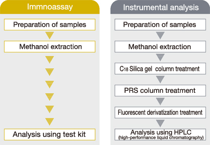 While instrumental analysis offers high accuracy, it requires complicated and time-consuming fluorescent derivatization, and sophisticated instrument operation as well as a large quantity of organic solvent such as methanol. The simpler pretreatment required for kit saves significant time. Additionally, only a small quantity of methanol is required as an extraction solvent for analyzing emamectin.