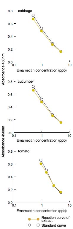 The figures show the comparison between standard curve with 10% methanol and reaction curve drawn with methanol extract of emamectin-added farm products (diluted to 10% methanol equivalent). The overlapping curves; demonstrate the suitability of this kit for analyzing trace emamectin without any interference from the original produce.