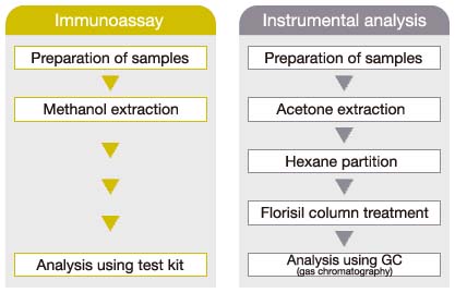 While instrument analysis offers high accuracy, it requires complicated and time-consuming pretreatment techniques, and sophisticated instrument operation as well as large quantities of acetone, dichloromethane or hexane as organic solvents. The simpler pretreatment required for kit saves significant time. Additionally, only a small quantity of methanol is required as an extraction solvent for analyzing flutolanil.