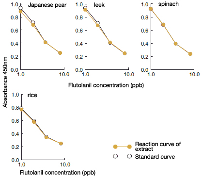 The figures show the comparison between standard curves with 10% methanol and reaction curved drawn with methanol extract of flutolanil-added farm products (diluted to 10% mthanol equivalent). The overlapping curves; demonstrate the suitability of this kit for analyzing trace flutolanil without any interference from the original produce.