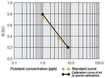 Flutolanil is a benzanilide fungicide that has pest control effect for rice sheath blight disease. It is used for not only rice but also vegetables or fruits. This kit allows an easy, rapid (within 2 hours), sensitive, quantitative, multi-sample analysis of flutoranil that remains in farm products. This kit is best applied for inspection at delivery time/prior to processing inspection or primary screening in production sites.
