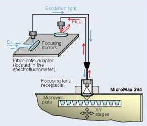 Light from the excitation and emission monochromators is carried via a fiber-optic bundle to and from the MicroMax 384, thus the user may scan with the main spectrofluorometer and select any excitation and emission wavelength pair for intensity measurements.
