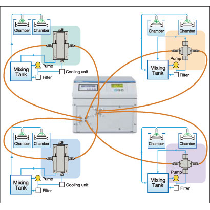 The CS-100F4 is a new system concept that enables multipoint chemical measurement in a single unit. The CS-100F4 further expands HORIBA’s CS series lineup, which is known for its high-precision concentration monitoring of the various chemicals used in the etching and cleaning processes for semiconductor manufacturing. Sampling cells (up to four points) are connected directly to the internal piping of the cleaning unit by fiber optic cable and the transmission of optical signals allows inline real-time measurement. As well as improving cost savings and space utilization, this multipoint inline measurement delivers optimal control of the many chemicals used in semiconductor etching and cleaning processes.