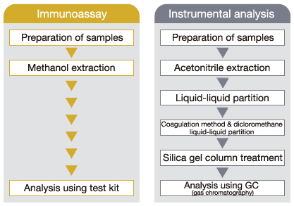 While instrumental analysis offers high accuracy, it requires complicated and time-consuming pretreatment techniques, and sophisticated instrument operation as well as , and also a large quantity of acetonitrile, hexane, dicloromethane or Ethyl acetate as organic solvent. The simpler pretreatment required for kit saves significant time. Additionally, only a small quantity of methanol is required as an extraction solvent for analyzing myclobutanil.