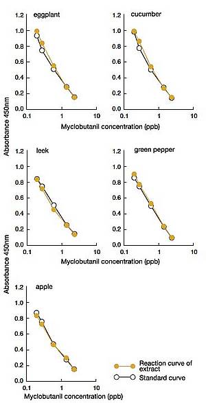 The figures show the comparison between standard curves with 10% methanol and reaction curves drawn with methanol extract of myclobutanil-added farm products (diluted to 10% methanol equivalent). The overlapping curves; demonstrate the suitability of this kit for analyzing trace myclobutanil without any interference from the original produce.