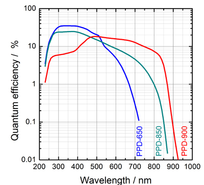 Three models of PPD are available to suit different spectral ranges. (See the specification table.) The PPD-850 and PPD-900 versions have extended red sensitivity and feature integral thermoelectric cooling of the PMT to reduce the dark count rate. Both these versions include the DPS-1 power supply module. The uncooled PPD-650 version requires only 15V, so the DPS-1 is an optional power supply in this case.