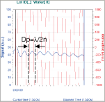 The horizontal axes represents time. An interference cycle is generated with respect to the etching depth as the etching process progresses. The amount of etching during one cycle is displayed as Dp = λ (laser wavelength 670 nm) / 2n (refractive index of etching film).