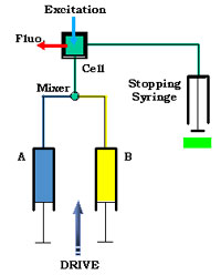 - The resultant mixture passes through a measurement flow cell and into a stopping syringe.