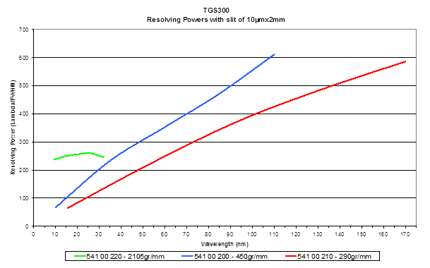 Dispersion | 2105 gr/mm : 0.5 nm/mm at 9.5 nm 450 gr/mm : 2.3 nm/mm at 10 nm 290 gr/mm : 3.5 nm/mm at 15.5 nm |