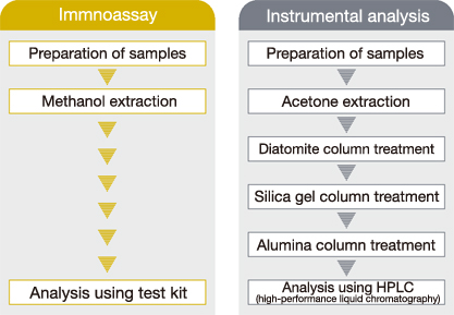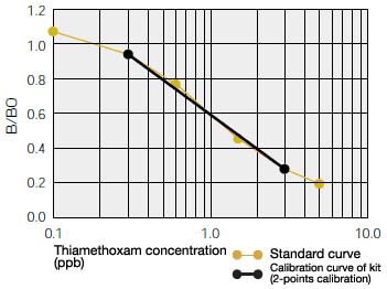 Thiamethoxam is one of neonicotinoid insecticide. It is used for multiple farm products because of its wide insecticidal activity range. This kit allows an easy, rapid (within 2 hours), sensitive, quantitative, multiple sample analysis of thiamethoxam that remains in farm products or in the environment. This kit is best applied for inspection at delivery time/prior to processing or primary screening in production sites.