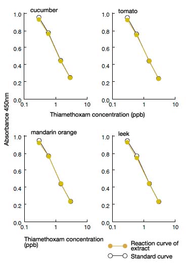 The figures show the comparison between standard curves with 10% methanol and reaction curves drawn with methanol extract of thiametoxam-added farm products (diluted to 10% methanol equivalent). The overlapping curves; demonstrate the suitability of this kit for analyzing trace thiametoxam without any interference from the original produce.