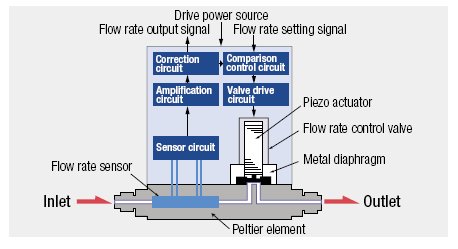 The LV-F series of mass flow controllers and LF-F series of mass flow meters use the same measurement principle. The LV-F also has a piezo actuator valve and an internal comparison control circuit. These compare the flow rate setting signal and the flow rate output signal and automatically control the valve aperture so that the two signals will match to control the liquid. Since they use a feedback control system, there are no flow rate variations as a result of external factors, and, there fore, stable, accurate control is possible. The use of piezo actuator valve, which is both stable and does not generate heat, as the control valve makes these units ideal for flow control of liquids with low boiling points.