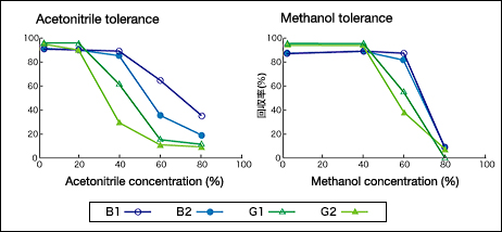 - AFLAKING has a high tolerance against acetonitrile and methanol which are widely used for Aflatoxin extraction. The concentration of acetonytrile is to 20% and that of methanol is to 40% for maintaining higher than 80% recovery ratio of Aflatoxin. This characteristic feature allows clean up of Aflatoxin with less dilution of the food extract.