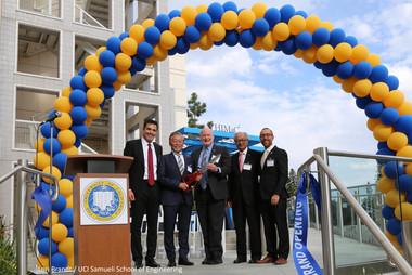 The grand opening, held on Oct. 11, featured a reception for the 145 attendees, facility tours, as well as keynote speeches made by HORIBA and UCI executives. Pictured at the ribbon-cutting are: Far left - HIMaC2 Director Vojislav Stamenkovic, UCI professor of chemical and biomolecular engineering. Atsushi Horiba, Chairman & Group CEO – HORIBA; In the middle with the scissors is UCI Chancellor Howard Gillman. Next is Jai Hakhu, Executive Corporate Officer at Horiba Ltd., and finally, on the far right is Magnus Egerstedt, dean of the Henry Samueli School of Engineering.