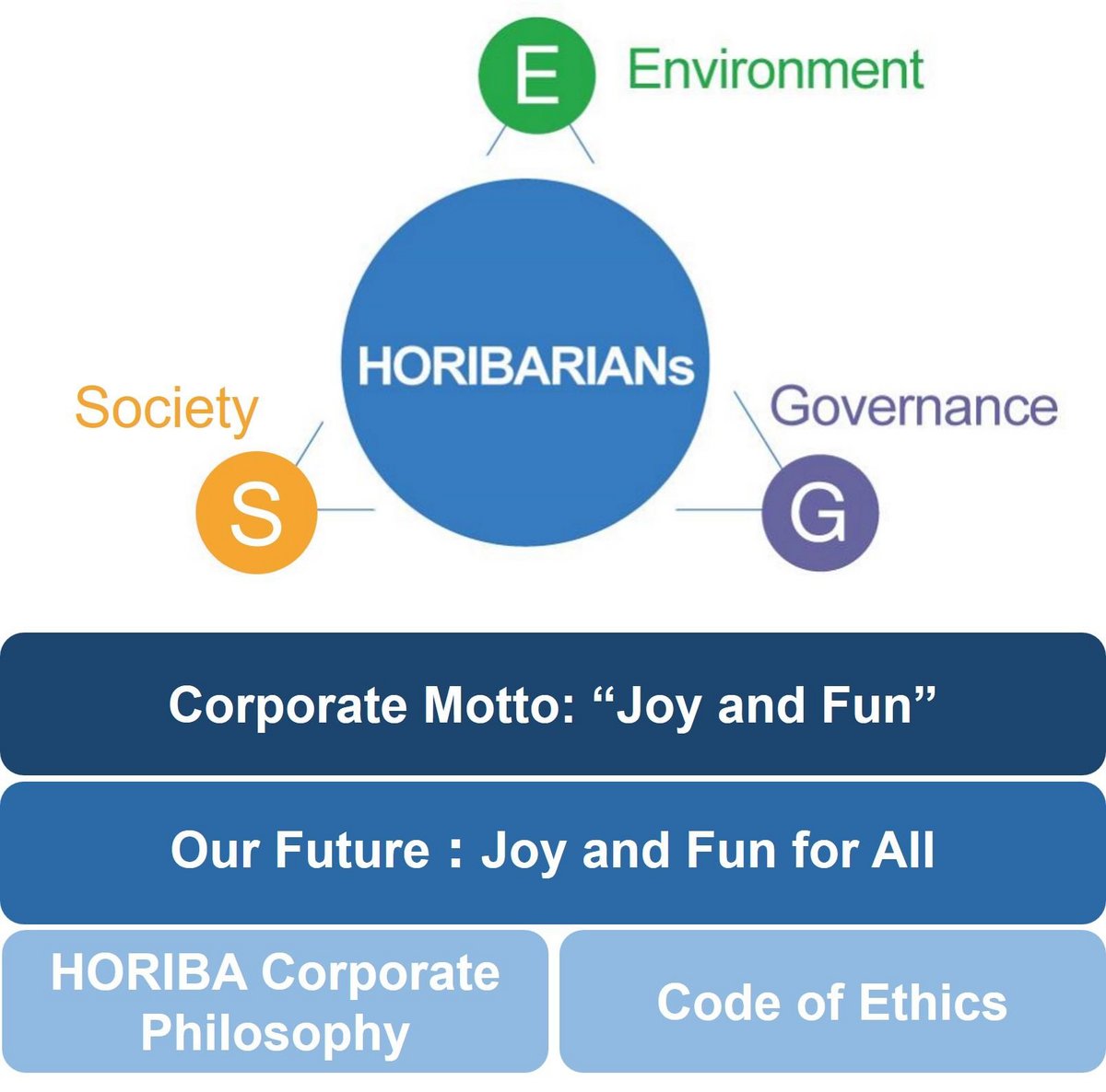 HORIBA will contribute to develop a sustainable society by creating an environment in which individual employees can fully demonstrate their talents and capabilities. As well as this, HORIBA will implement corporate activities that create social values for all global stake holders around the world including nature, next generations, and society itself, which will be delivered to achieve HORIBA’s Vision, “Joy and Fun for All.”