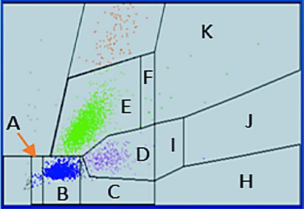 White cell matrix (left panel) for the cell differential counts for Yumizen H1500 and Yumizen H2500 display the populations of NRBC (A), Lymphocytes (B), “atypical” lymphocytes (C), monocytes (D), neutrophils (E) including “left-shifted” neutrophils (F), eosinophils (G), immature lymphocytes (H), immature monocytes (J) including “left-shifted” monocytes (I) and immature myeloid cells (K).