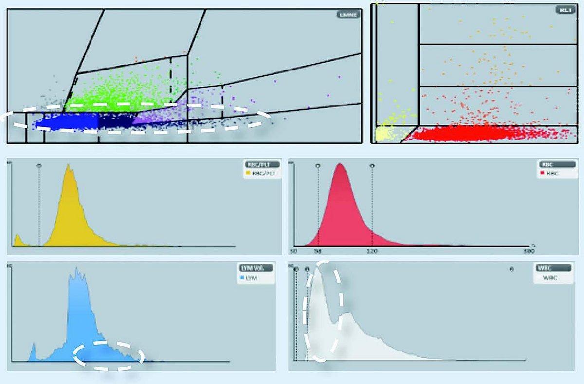 On the DIFF scattergram we observe the presence of immature monocytic population. The population is essentially composed of all step of monocytes maturation between the monoblasts, promonocytes and monocytes. The monoid population is perfectly defined in the DIFF scattergram in the dedicated area. We observe also the severe neutropenia. On the WBC histogram, we observe the important ratio of the monocyte cells versus the lymphocyte or granular cells.