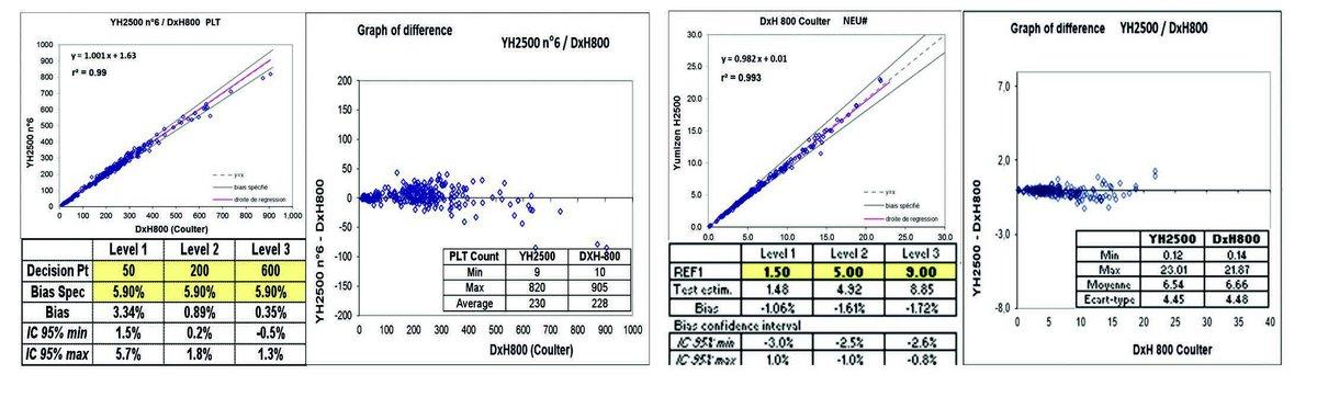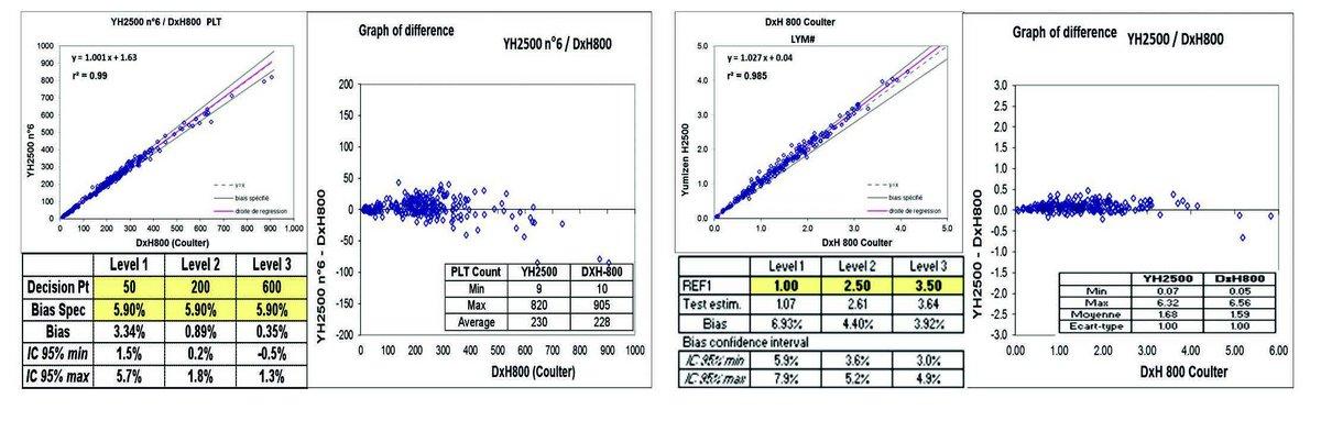The Yumizen H2500 instrument is safe, as effective, and performs as well or better than the BCI DXH-800 for all the usual CBC/DIFF parameters. The novel optical extinction platelet count performs as well or better than impedance counts. Ergometric features of the instrument were identified by the naïve users as those functions and custom flag settings, designed to be done within the Yumizen P8000 middleware module. The body fluids analytical validation will have to be evaluated on a larger statistical series (Fig 6).