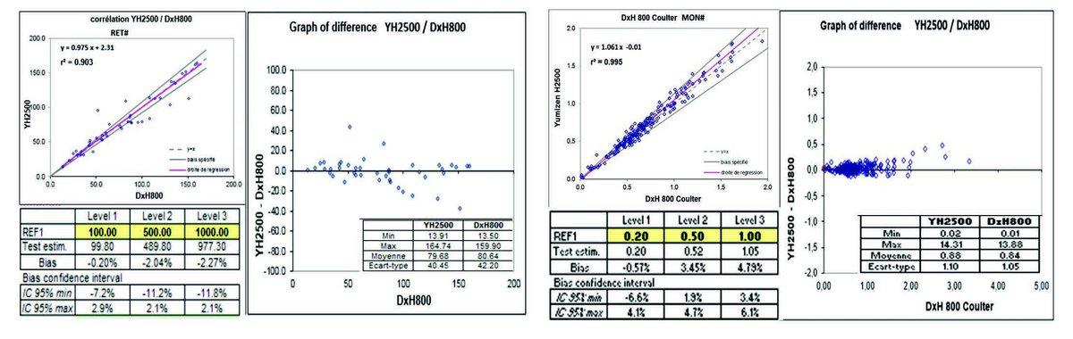 273 Fresh blood samples collected in K2 or K3 EDTA from patients and healthy controls were analyzed on a Yumizen H2500 instruments with Yumizen P8000 middleware for method comparison to Beckman Coulter DXH800 instruments. Method comparison and bias estimation were performed according to CLSI EP09-A3. Statistical analysis was performed using Passing Bablok regression fit with Pearson’s and Bland Altman’s difference plots. Precision, linearity and limit of detection were determined according to CLSI and ICSH guidelines.