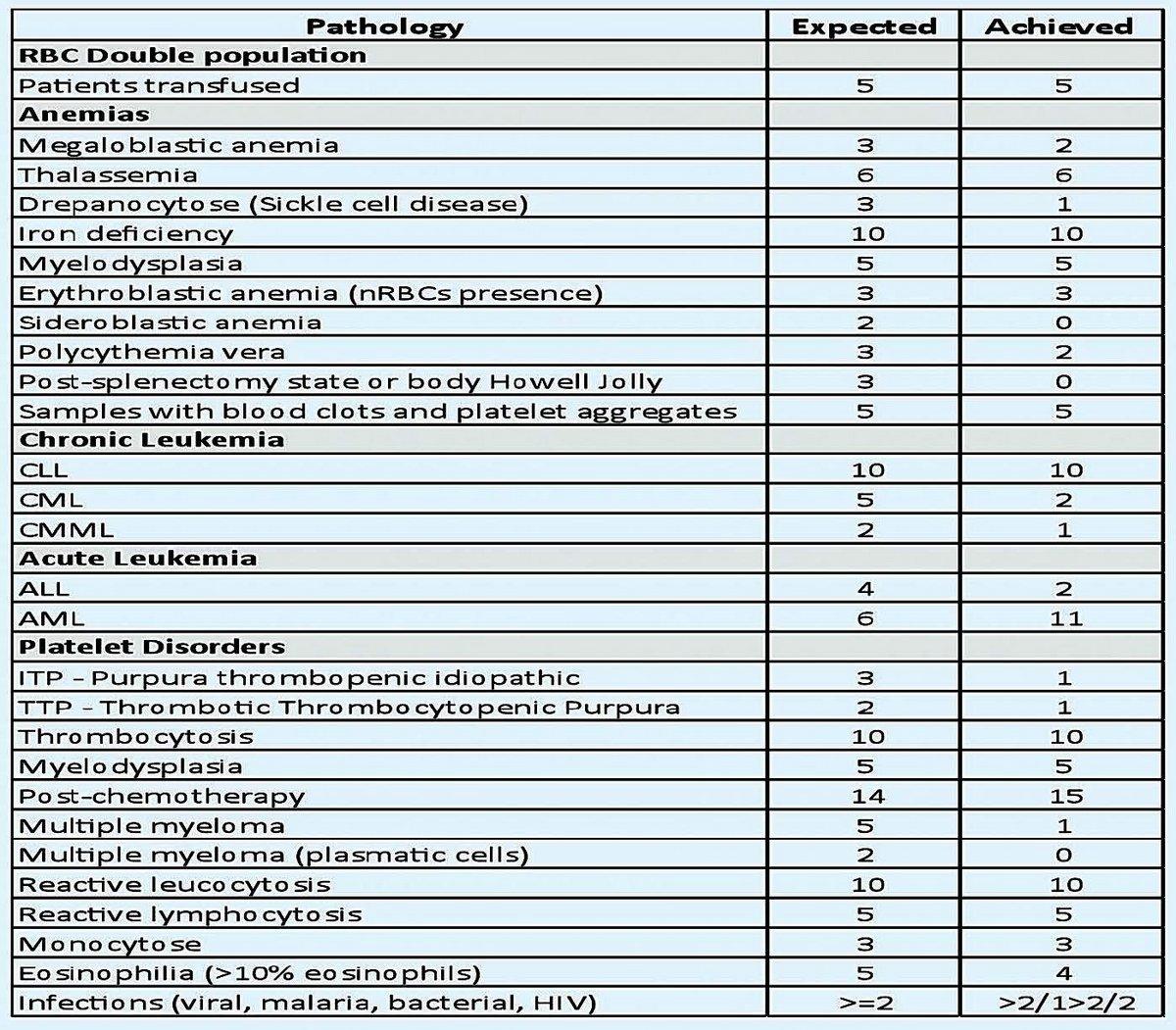 HORIBA Medical has released a new laboratory automation system for hematology testing, the HORIBA Evolutive Laboratory Organization (HELO) system, which includes a new high throughput blood cell counters that offers CBC/DIFF parameters, including routine nucleated RBC counts, fluorescence based reticulocyte analysis and optical extinction platelet counts and body fluid (BF) counting. Initial validation studies were performed to confirm performance specifications on precision, LOQ, linearity, precision and method comparisons to other blood counter models and microscopic leukocyte differential counts, which are reported here. The cell differential matrix is based on the patented HORIBA Double Hydrodynamic Sequential System "DHSS" flow cytometric design. Throughout the performances evaluation, we were able to collect a large number of clinical cases that were the subject of a dedicated study.