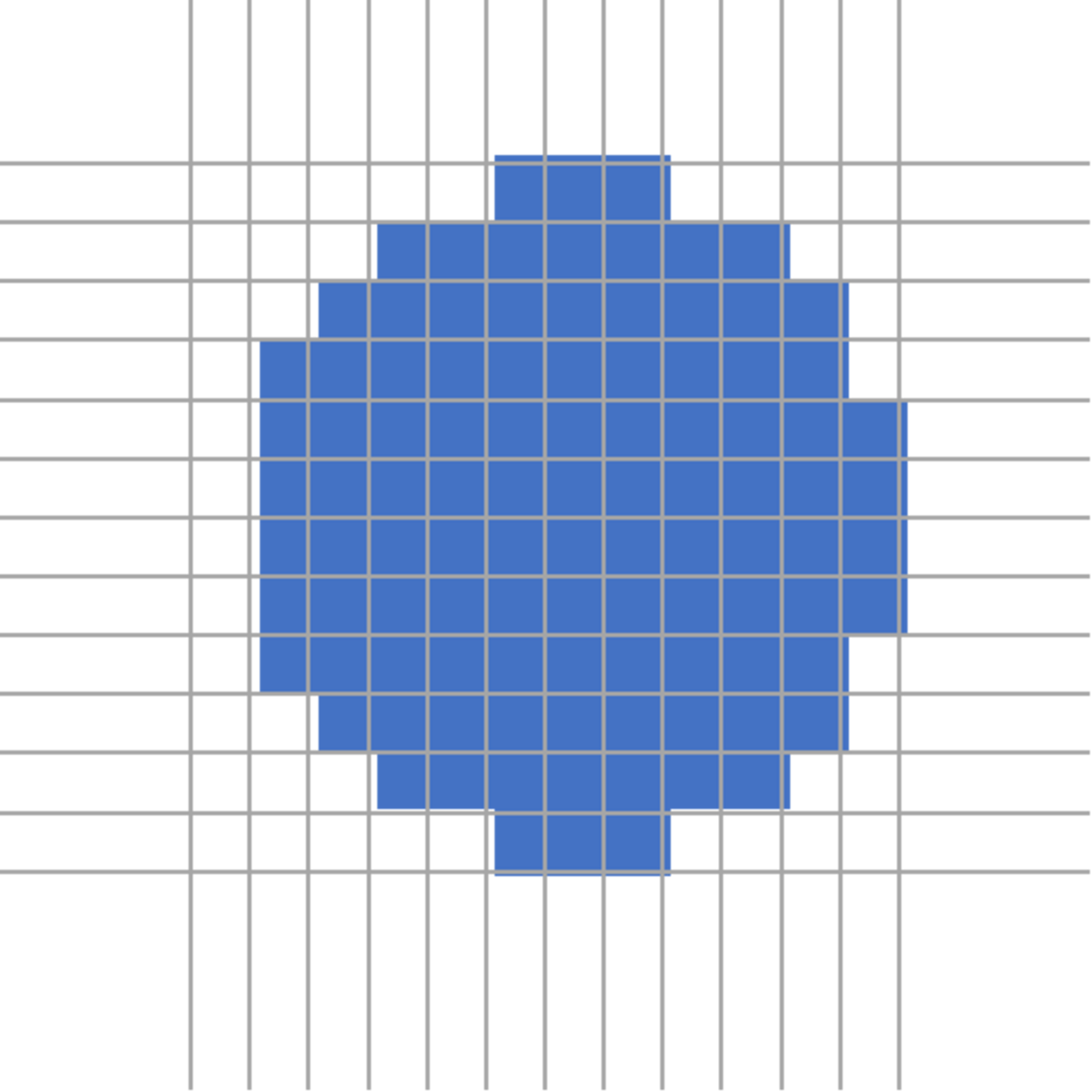 Detected particles are represented as groups of pixels, as shown in the image here. Therefore, particle-size accuracy is determined by the pixel size (i.e., the actual length represented by one pixel). In contrast, the minimum detectable particle diameter depends on both the pixel size and the optical system. For example, if a particle image is captured with an optical system that has a 5 μm resolution and a pixel size of 100 nm, the particle size can be measured with an accuracy of approximately 100 nm, while the minimum detectable particle diameter is approximately 5 μm.
