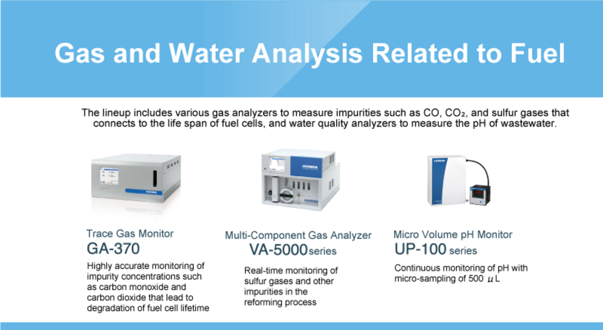 各种气体分析仪可以测量影响燃料电池寿命的杂质气体,如 CO, CO2,和硫。另外,水质分析仪也可以测量废水中的pH以确认燃料电池的劣化状态。他们都对燃料电池的研发有着重要作用。
