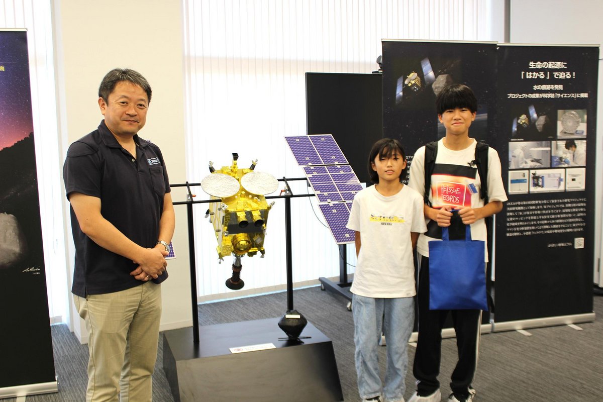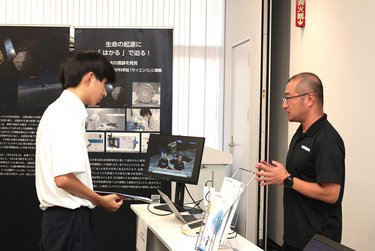 Analytical equipment actually used in the project and a model of Hayabusa2 were also on display at the venue, which participants eagerly examined.