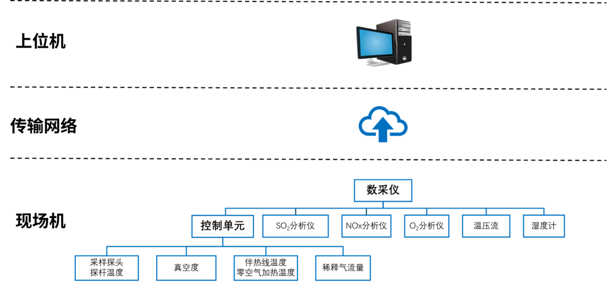 污染物自动监测监控系统从底层逐级向上可分为现场机(自动监控设备及数采仪)、传输网络和上位机三个层次。上位机通过传输网络与现场机通信(包括发起、数据交换、应答等)。架构如下: