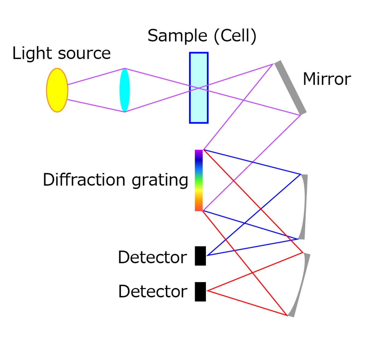 First, light from a light source is shone onto a cell with the sample to be measured. A mirror reflects light passing through the sample and transmits it to an optical component called a diffraction grating. The diffraction grating has the ability to separate the light beam into ultraviolet, near-infrared, and other individual wavelengths, before reflecting them at different angles. Each decomposed wavelength is directed to its own detector, which quantifies how much of that wavelength was absorbed by the sample.