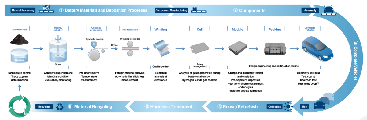 We contribute to the development of storage battery manufacturing and its recycling through a wide range of measurement and analysis technologies and engineering, from R&D of battery materials, performance evaluation, production management, support for electric vehicle development to recycling, from particles to vehicle, then back to particles.