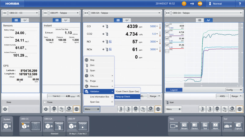 The newly developed software for the OBS-ONE is integrated with the same operating platform as the MEXA-ONE, CVS-ONE and other devices. The intuitive, ergonomic design of the new software platform makes system operation easier. System control and a complete system view of other measurement devices are available from one single display. User support for system operation such as maintenance, alarms, and message functions has been further enhanced.