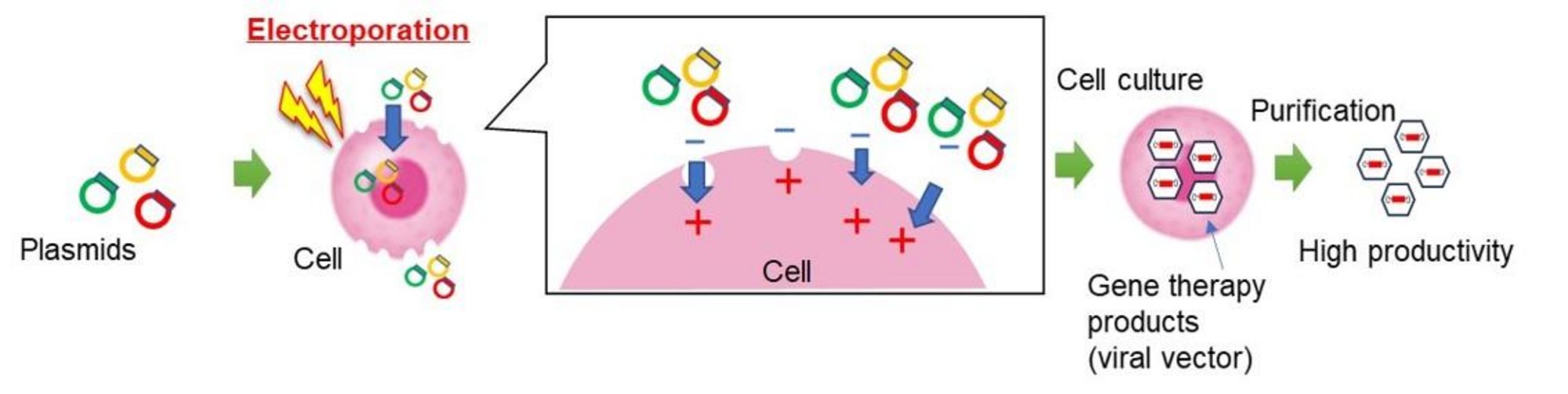 *2 A technology that uses controlled electrical pulses to create minute pores in cell membranes, allowing genes to be directly delivered into cells. This enables high-efficiency gene delivery and is anticipated to enhance productivity while reducing costs in the manufacture of gene therapy products. This technology was presented at the 26th Annual Meeting of the American Society of Gene & Cell Therapy held in Los Angeles, U.S., in 2023.