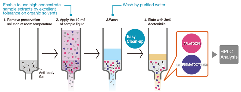 • Enable to clean-up Aflatoxins and Sterigmatocystin in small amount of extracts, it helps shortening the time of pre-treatments