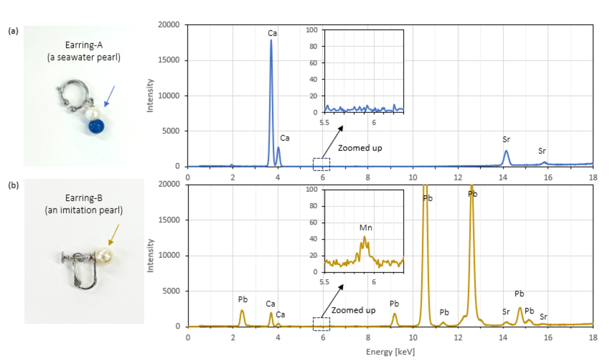 Thus, elemental analysis using HORIBA’s micro-XRF XGT-9000 could show different elements between the real seawater pearl earring and the imitation pearl earring in 30 seconds even without removing the decorative parts.