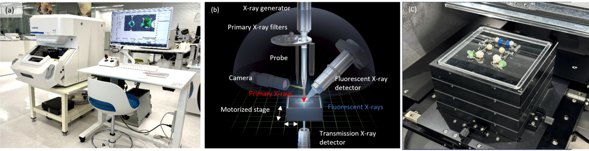 Figure 2. (a) HORIBA XGT-9000 X-ray Analytical Microscope; (b) Schematic diagram of the internal optics of the XGT-9000; (c) Multiple sample setting on a sample tray.