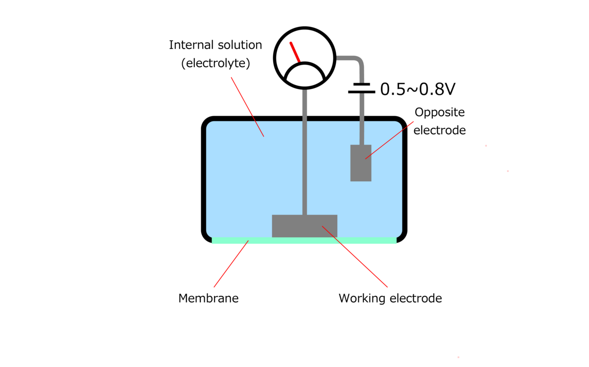 A polarograph-type DO electrode is made up of a pair of electrodes from different materials, a membrane, and internal solution. The oxygen contained in the solution is passed through a membrane with excellent oxygen permeability and absorbed into the internal fluid. The absorbed oxygen undergoes a reduction reaction at the working electrode, generating an electric current between the electrodes. This current is proportional to the DO concentration in the sample, so DO concentration is calculated with an external ammeter.