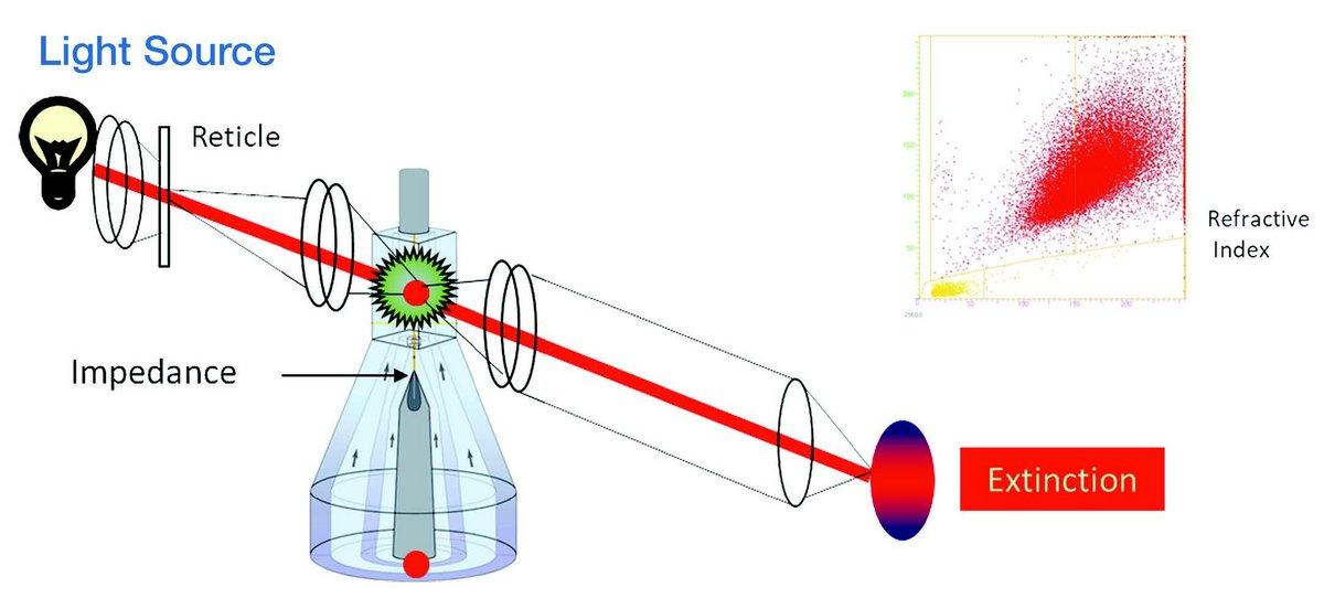Each cell is represented on two dimensional scattergram with size on X axis and extinction on Y axis. Optical extinction allows to better separate PLT from RBC even if size is similar (Figure 2).