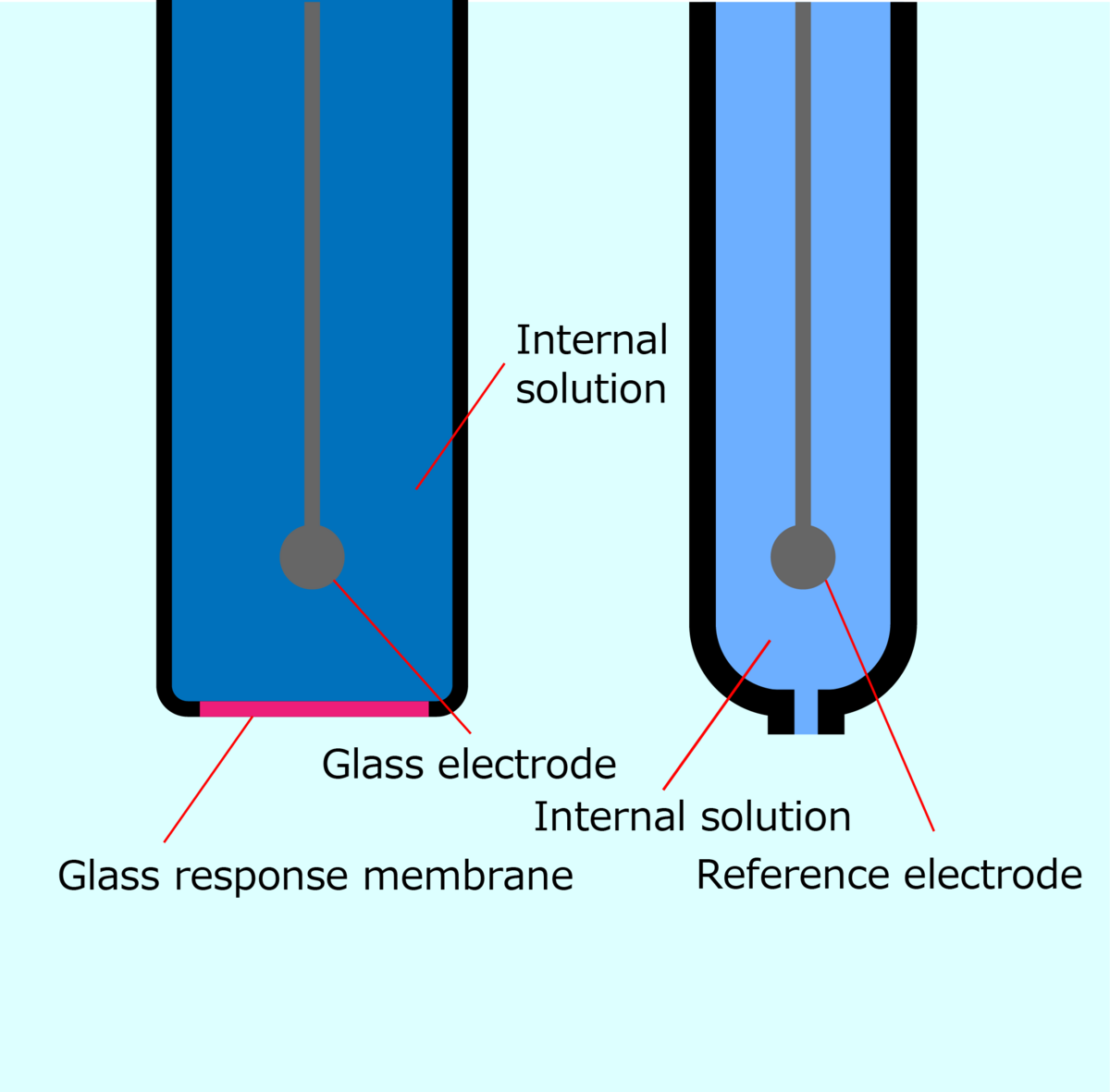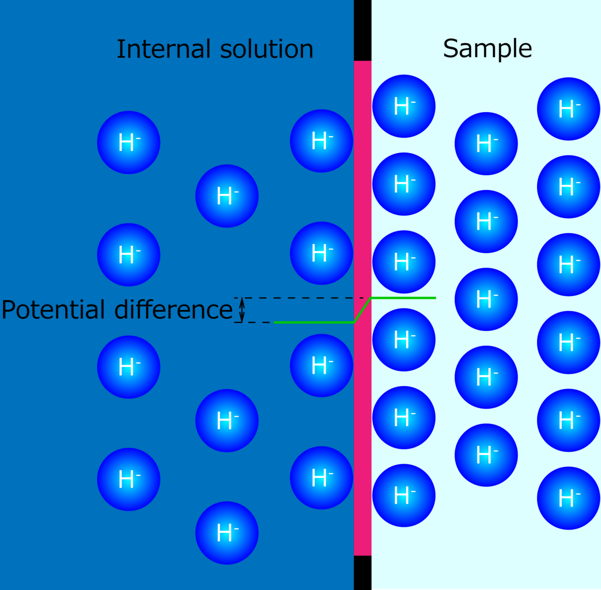 The glass electrode method is a pH measurement technique that uses a glass electrode (working electrode) with a glass response membrane responsive to hydrogen ions and a reference electrode that exhibits a constant potential for any sample. The interior (internal solution) and exterior (sample) of the glass electrode are separated by a glass response membrane. At each surface of the response membrane, a potential corresponding to the hydrogen ion concentration in the internal solution and sample is generated. By detecting the potential difference across both sides of the response membrane, the hydrogen ion concentration of the sample—that is, its pH—can be measured.